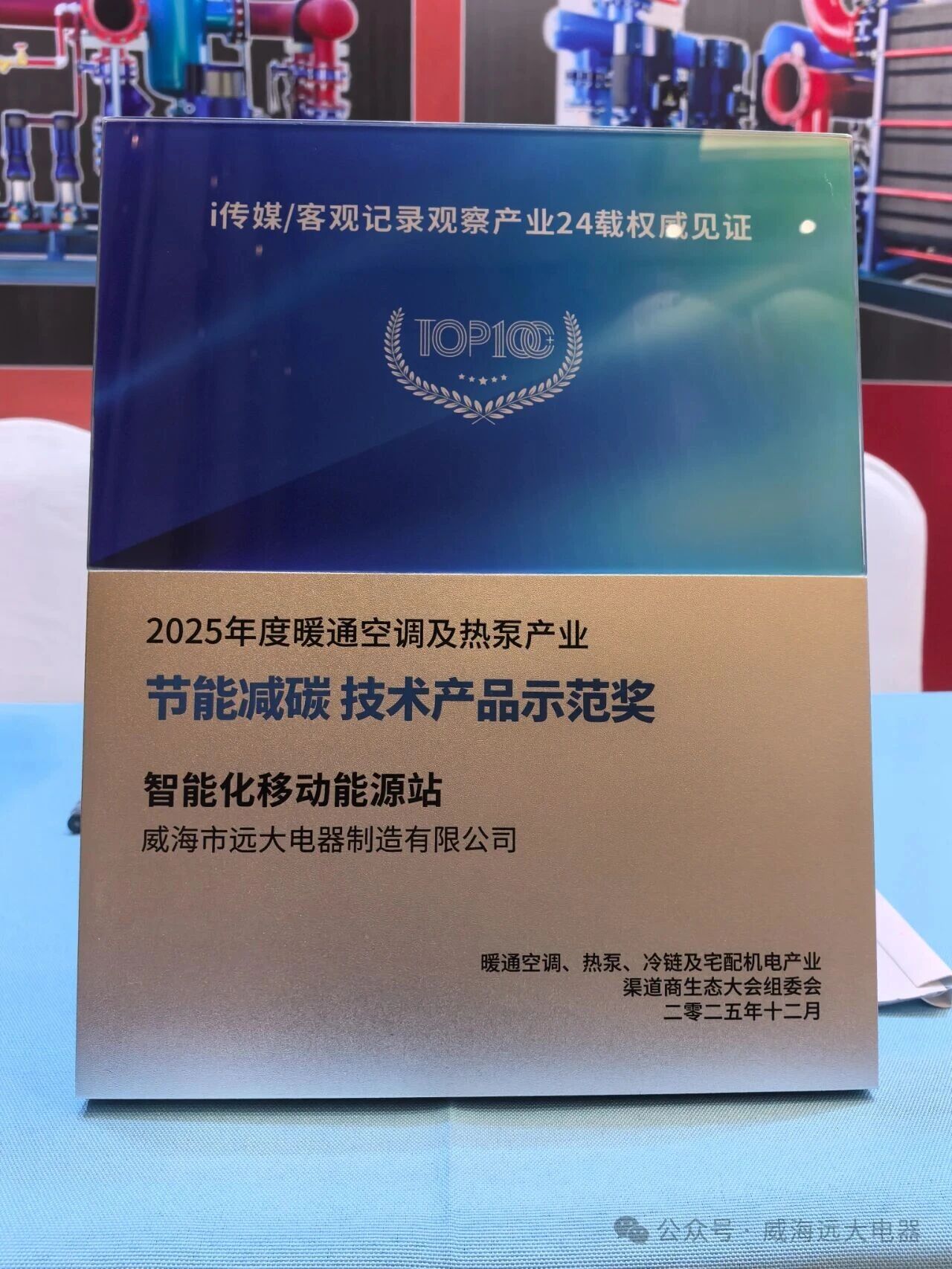 而在這場產(chǎn)業(yè)盛會上,威海遠(yuǎn)大憑借硬核實力脫穎而出,一舉斬獲兩項重磅榮譽——“2025 年度暖通空調(diào)及熱泵產(chǎn)業(yè)助推產(chǎn)業(yè)成長優(yōu)秀貢獻” 獎、“2025 年度暖通空調(diào)節(jié)能減碳技術(shù)產(chǎn)品示范獎”(獲獎產(chǎn)品:智能化移動能源站)